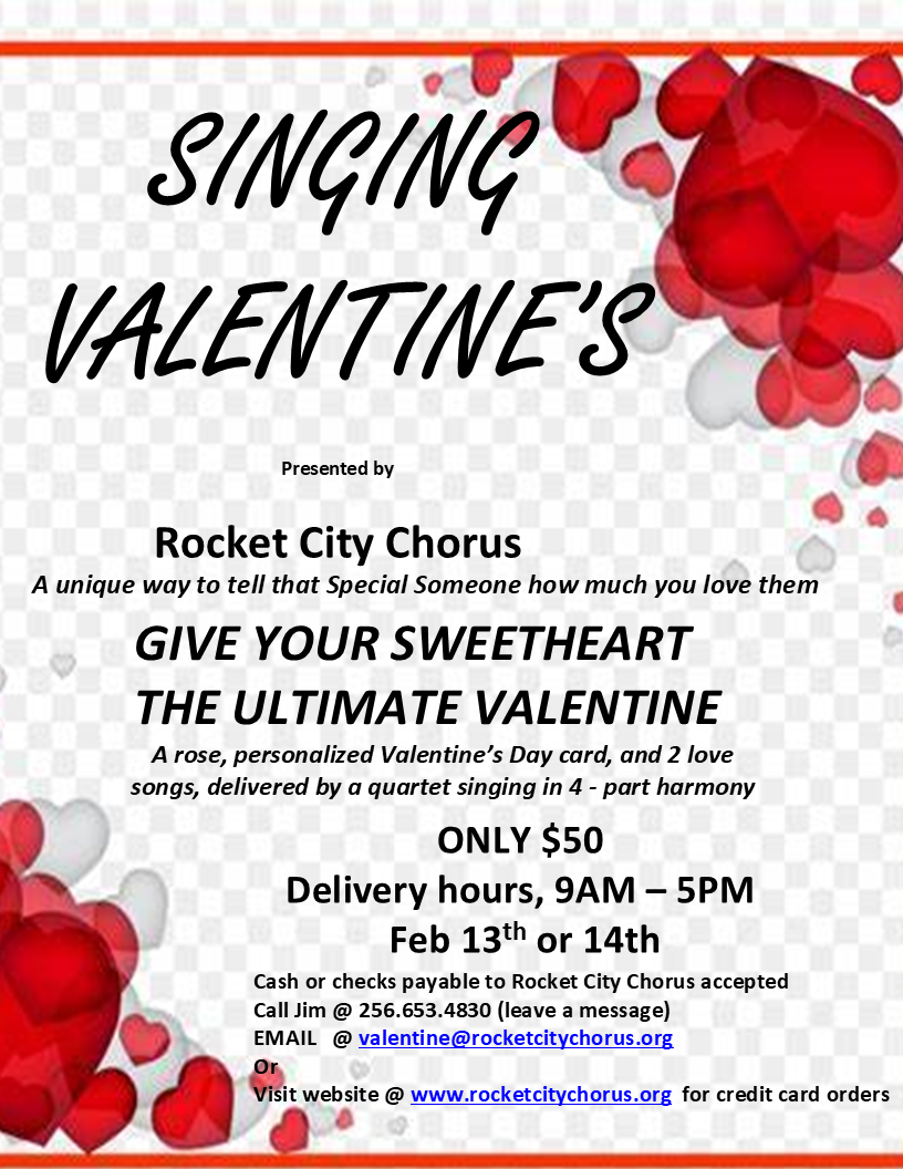 The Rocket City Chorus (EIN: 99-2172597) is a registered public charity in the State of Alabama with 501(c)(3) non-profit status. We are devoted to performing a cappella, four-part harmony. We will constantly strive to achieve the highest possible level of musical and entertainment excellence with all our performances.